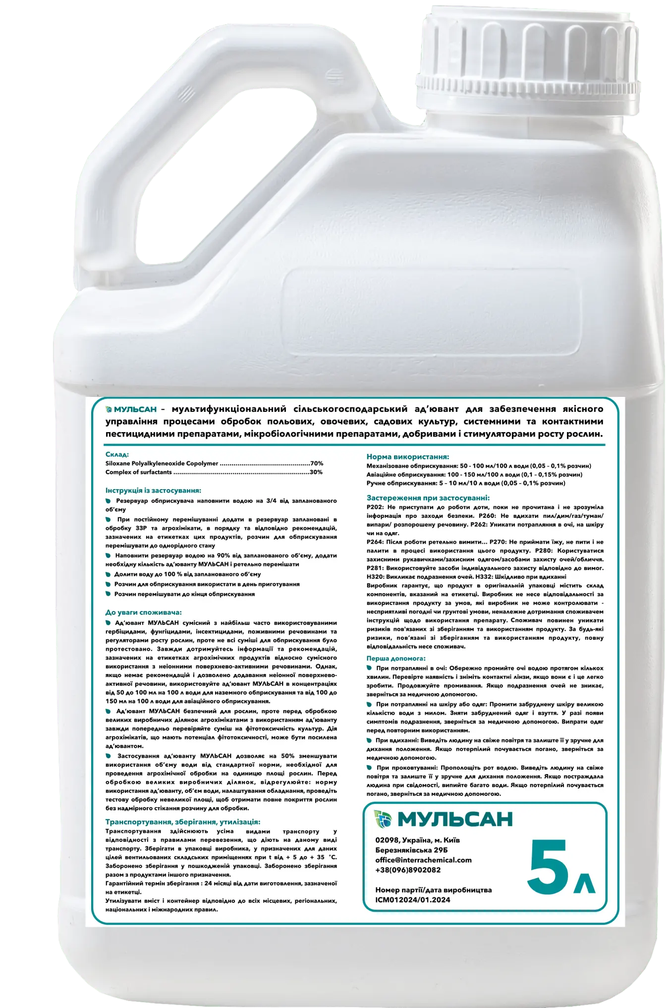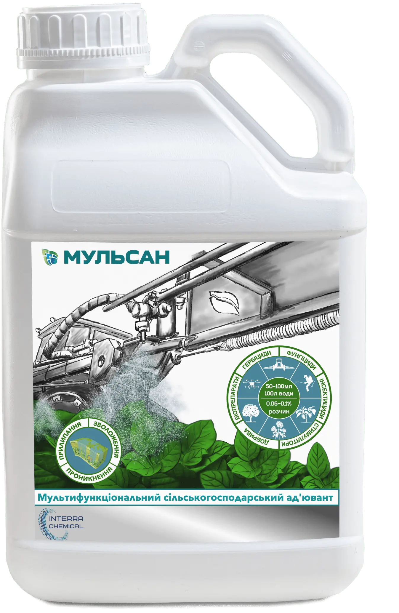 МУЛЬСАН – мультифункціональний сільськогосподарський ад’ювант для забезпечення якісного управління процесами обробок польових, овочевих, садових культур – системними та контактними пестицидними препаратами, мікробіологічними препаратами, добривами і стимуляторами росту рослин.